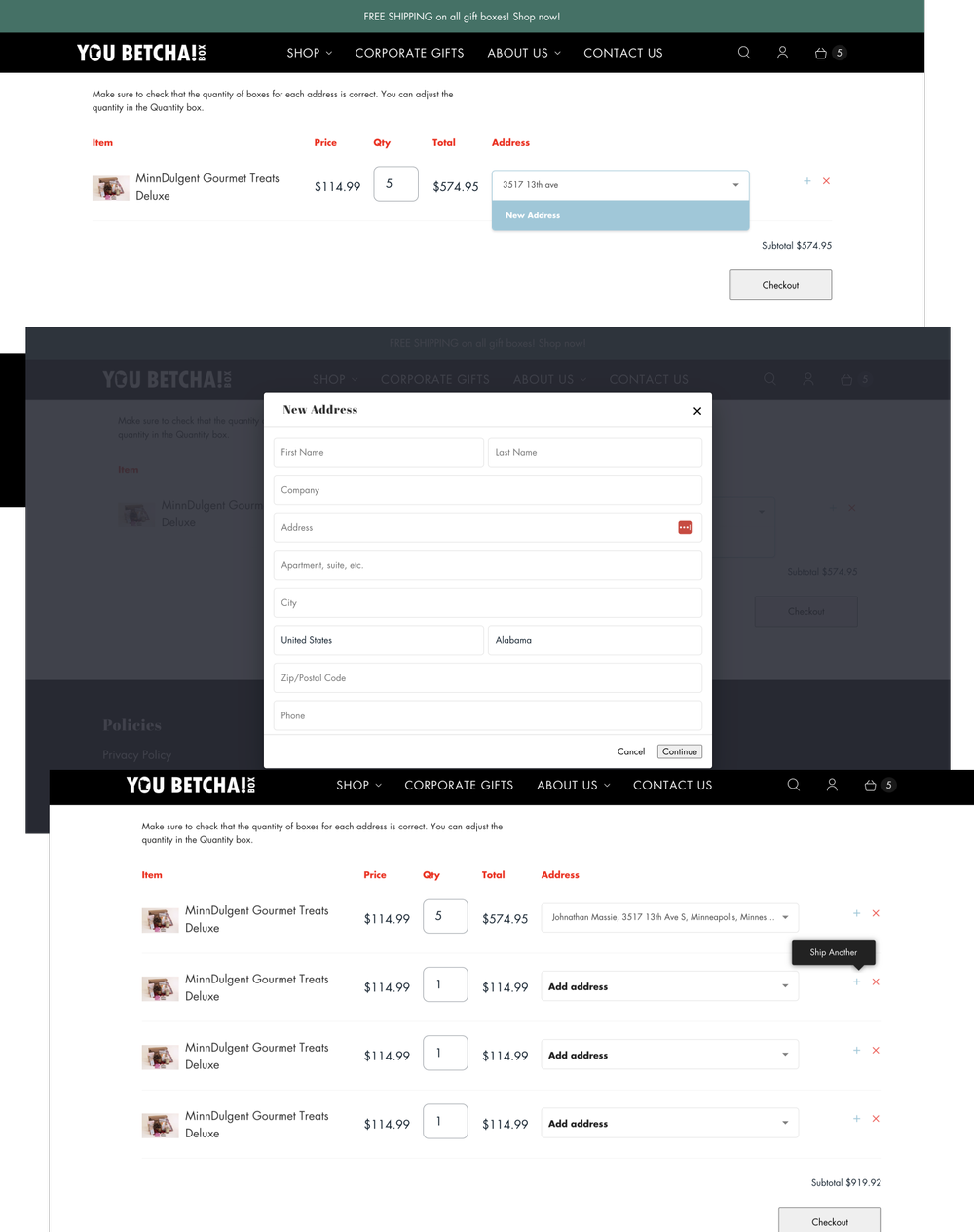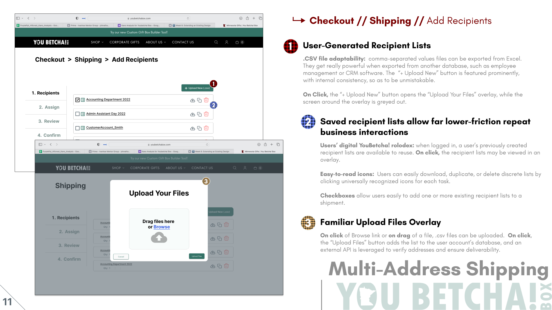 In the present version of the shipping experience, pictured left, customers have to enter each address one at a time. Every new address must be entered into a form in an overly.